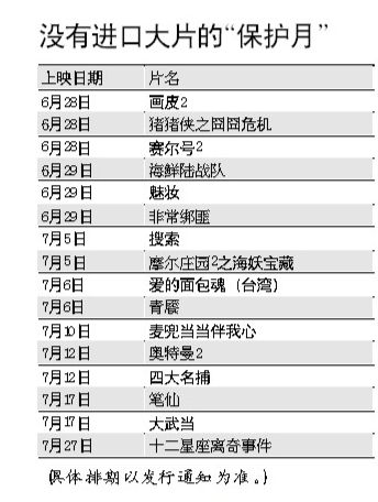 从院线公布的暑期档排片表上看,从6月中旬到7月底,共有20多部华语片陆续上映,其中有主打魔幻题材的《画皮2》,现实题材的《搜索》,“麦粉”们翘首以待的动画片《麦兜当当伴我心》等。而此前一直传闻将同步上映的好莱坞大片《普罗米修斯》、《超凡蜘蛛侠》等均未出现在排片中。有业内人士透露,这些好莱坞大片集体推迟引进,正是为了给暑期档的国产片“让路”。这就是网友们热议的“国产片保护月”。南方都市报记者采访了京沪穗等各地院线负责人,他们均表示,“保护月”并无明文规定,只是这段时间不鼓励引进海外分账大片。他们认为,保护国产片是“国际惯例”,“欧洲、韩国等地区均有对国产片的保护政策或者保护时段”,星美影院发行经理刘明说。受访的院线负责人也明确表示,从目前的情况看,不会有好莱坞引进大片突然定在这个档期。“之前已经上映的好莱坞电影如《马达加斯加3》等都还是会继续放映到正常下画,但其他暑期好莱坞大片会在7月底之后才相继上映。”中影南方院线负责人邱晴如是说。